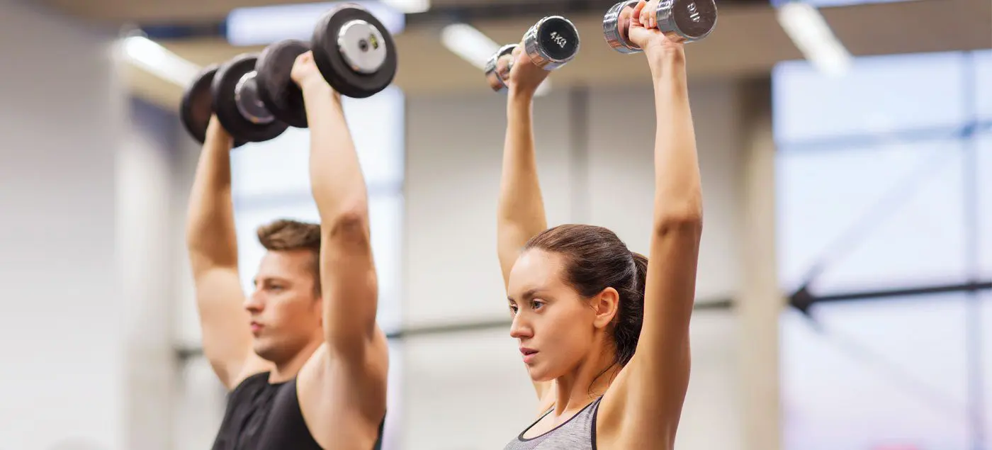 So, to start, you need to push the weights straight up above your head. The vertical motion range and the stability in doing so are what is going to activate your lateral, anterior and posterior deltoids together at the same time and give you generally stronger shoulders. Ensure, though, that you keep a slight bend in your arms at the top of the movement. Do not lock your elbows!