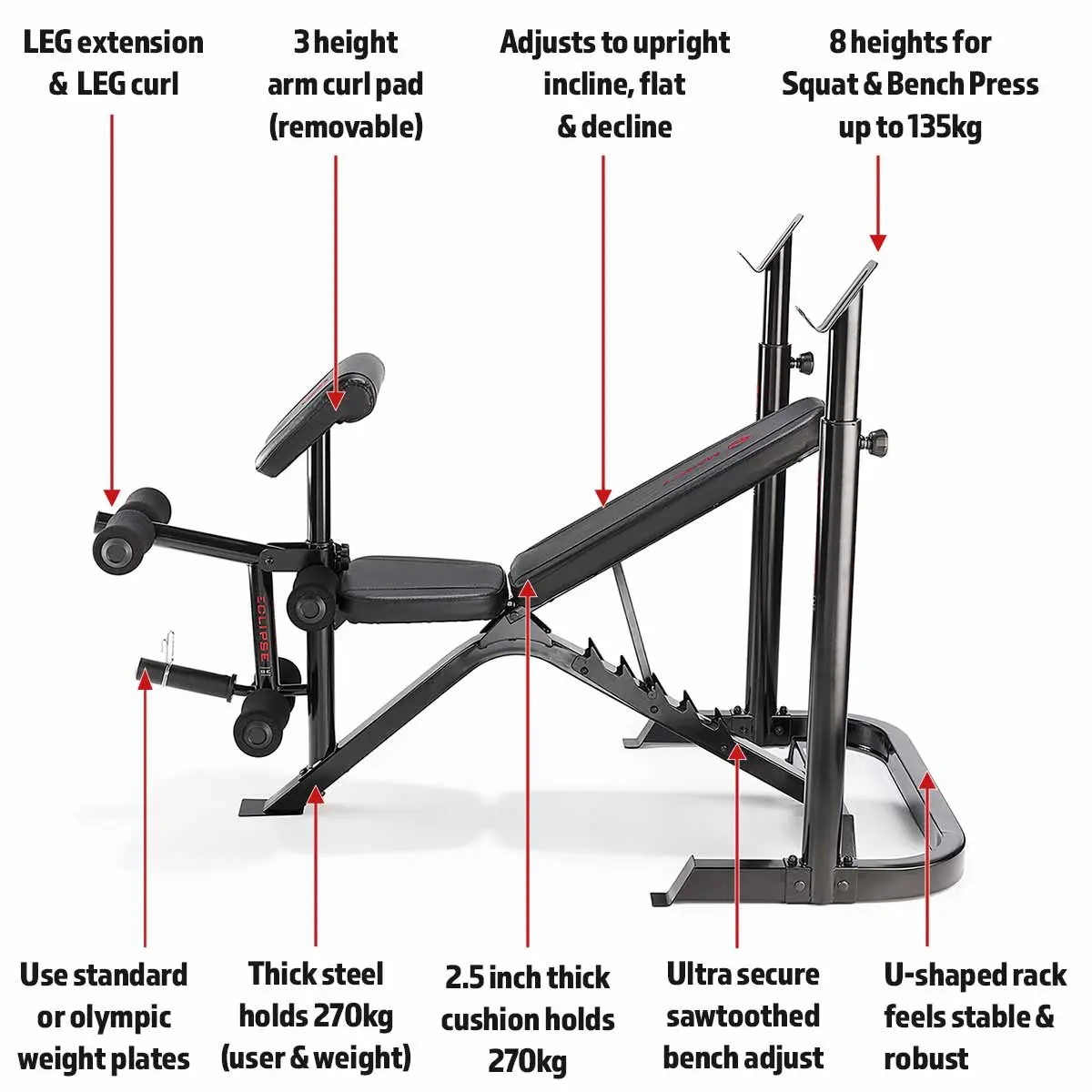 The bench alone is excellent, it is rated up to 270 kg (user & weights) and it uses a super safe Backrest adjustment featuring sawtooth catches that ensure the Backrest is stable and secure. Adjustment wise it can go through the whole range of flat, incline decline and upright positions.