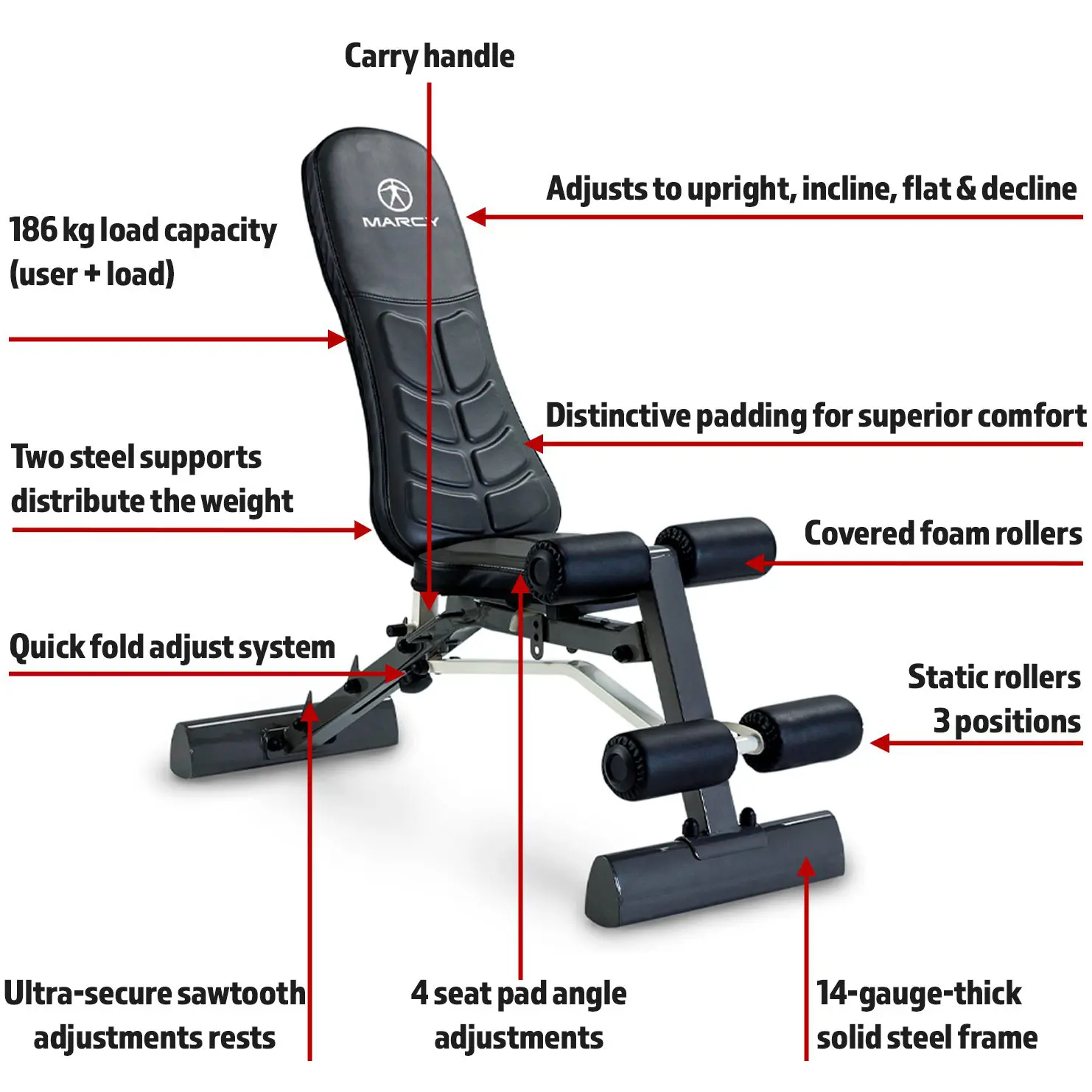 The reinforced multi-position back-pad allows for four unique presses: flat, incline, decline, and military, and the versatile design also allows you to tone your abs, arms, legs, and chest. To further enhance its robust feel, saw-toothed adjustment catchers ensure the bench is equally safe at every angle with a weight capacity of 185 kg. So, no matter what exercise you’re performing, the Marcy SB-10100 Deluxe Folding Weight Bench keeps you in comfort; the unique upholstery looks distinctive and enhances the support to your back.