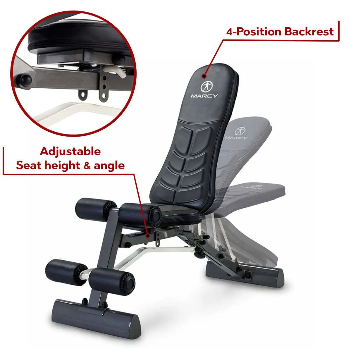 Backrest adjusts to flat, incline, decline & upright angles
