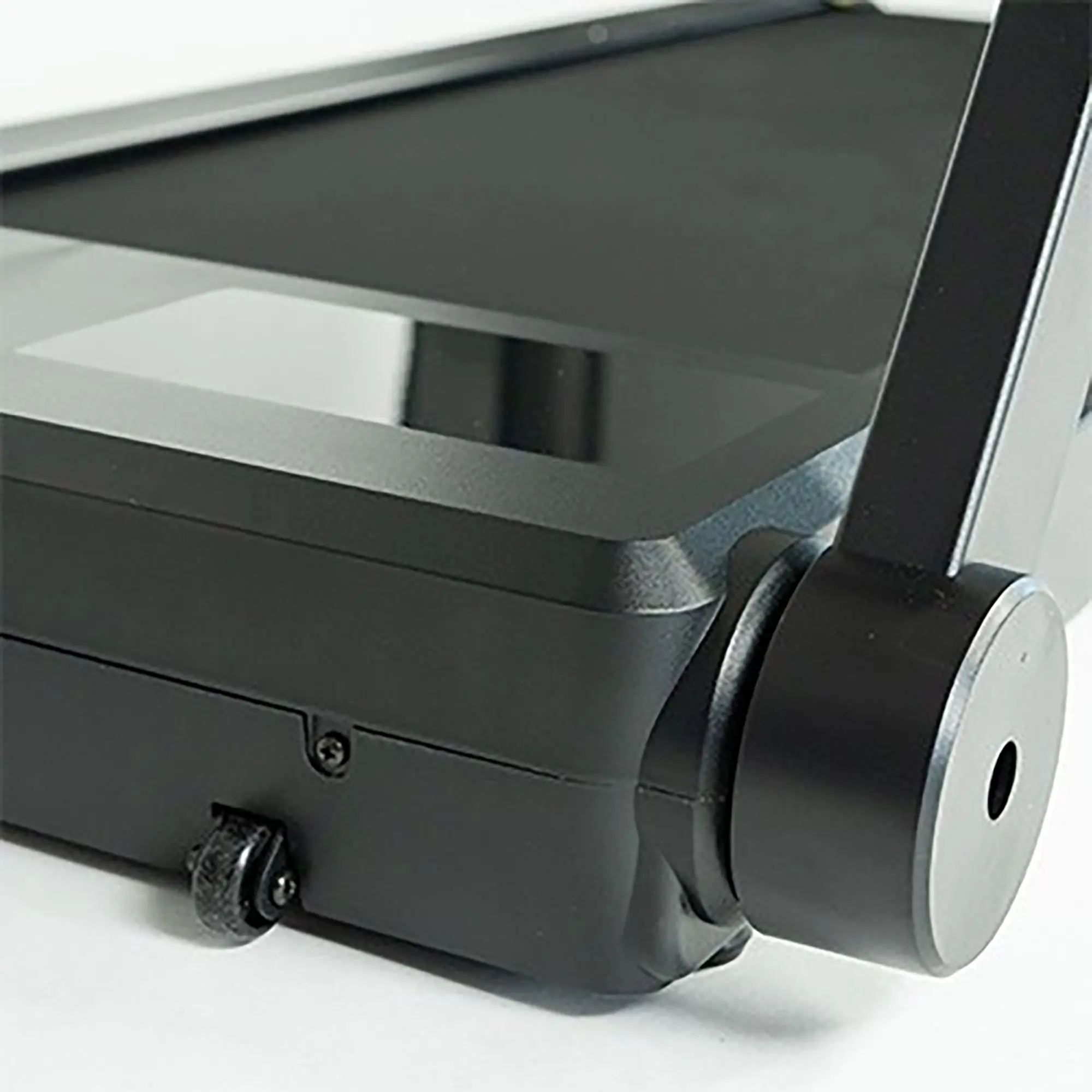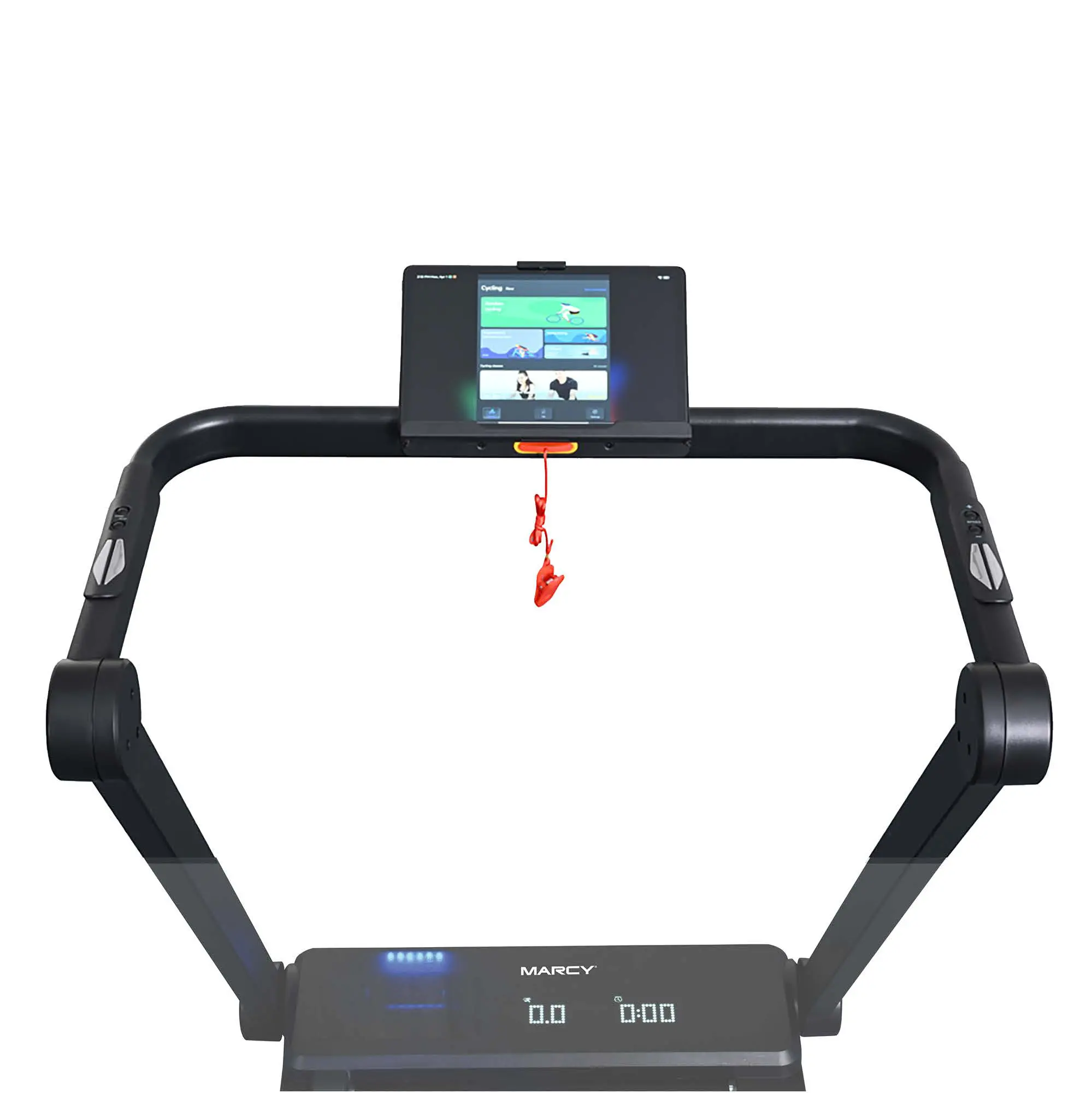 The LED console displays time, speed, distance, calories, steps, and pulse. Built-in grip pulse sensors and optional wireless heart rate monitors allow precise tracking, while the tablet/phone holder lets you follow apps, routes, or entertainment while training.