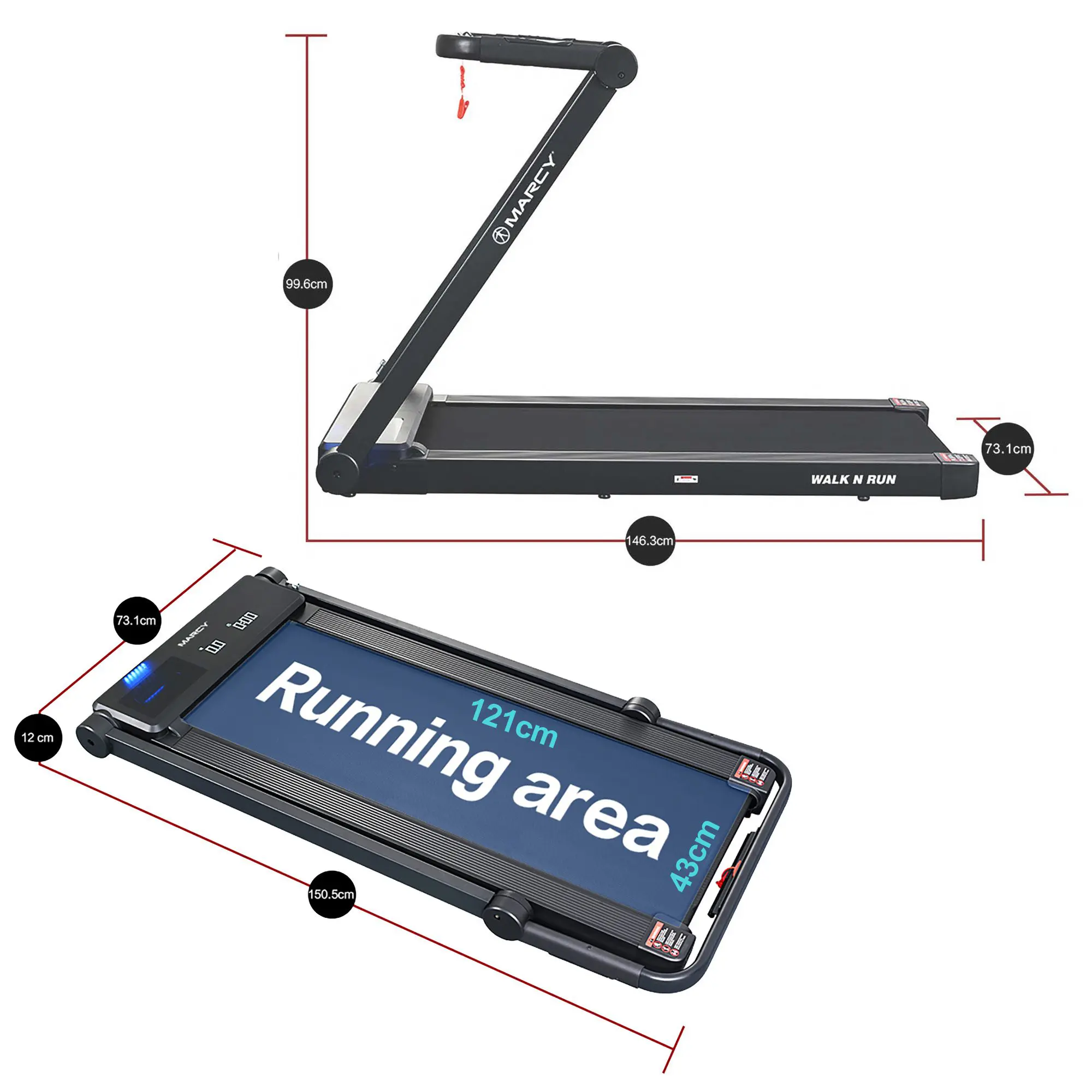 Seamlessly adjust your workout intensity with integrated speed up/speed down buttons conveniently located in the handles. You can also adjust the handles for a comfortable. The convenient one-fold design of the Marcy Walk N’ Run Walking Pad Treadmill enables quick and hassle-free storage. Weighing just 40Kg with integrated transport wheels, ensuring convenient storage and placement.