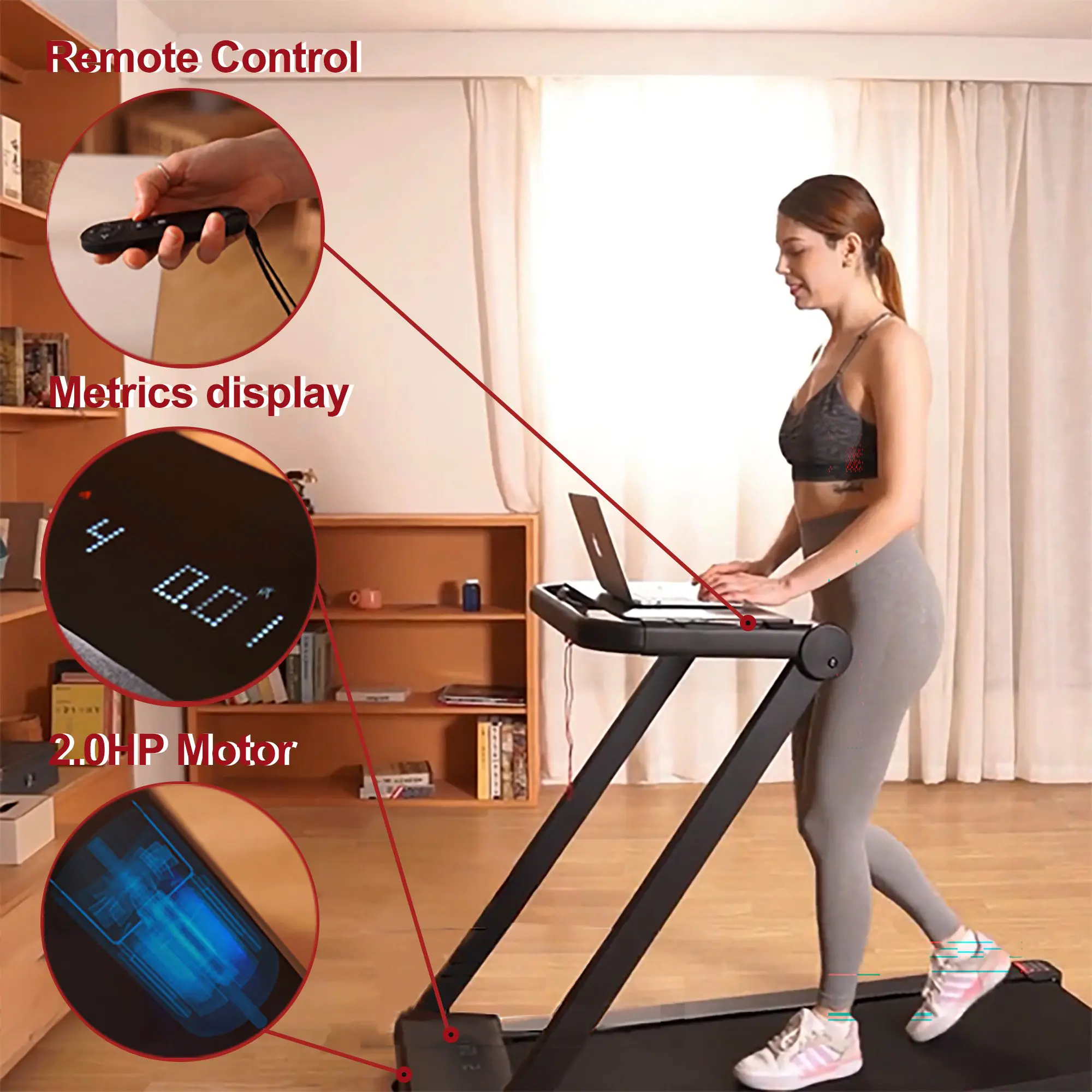 PROGRAMS & METRICS MONITORING – 18 Workouts. When using the walking pad, use the included Remote Control to do all settings while you walk – The LED display console on the cockpit displays all metrics. When using as a treadmill, the grip pulse sensors allow you to monitor your heart rate in real time, and the built-in tablet/phone holder allows you to entertain yourself or track your progress.