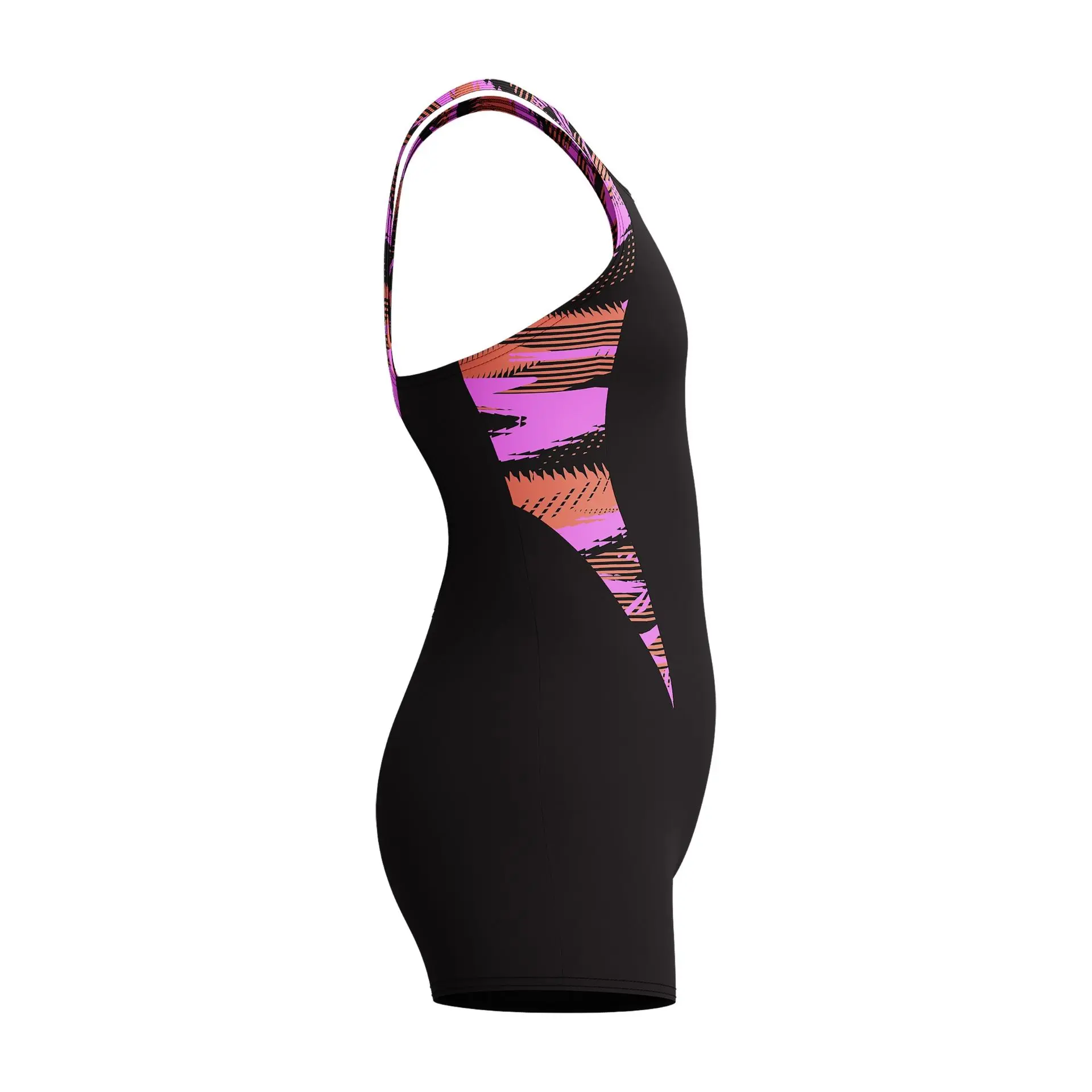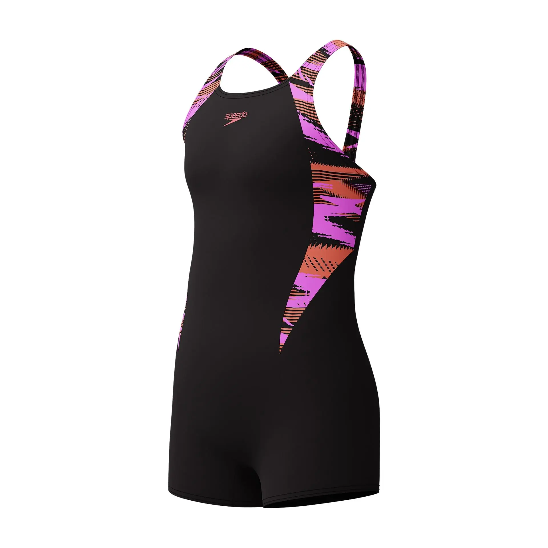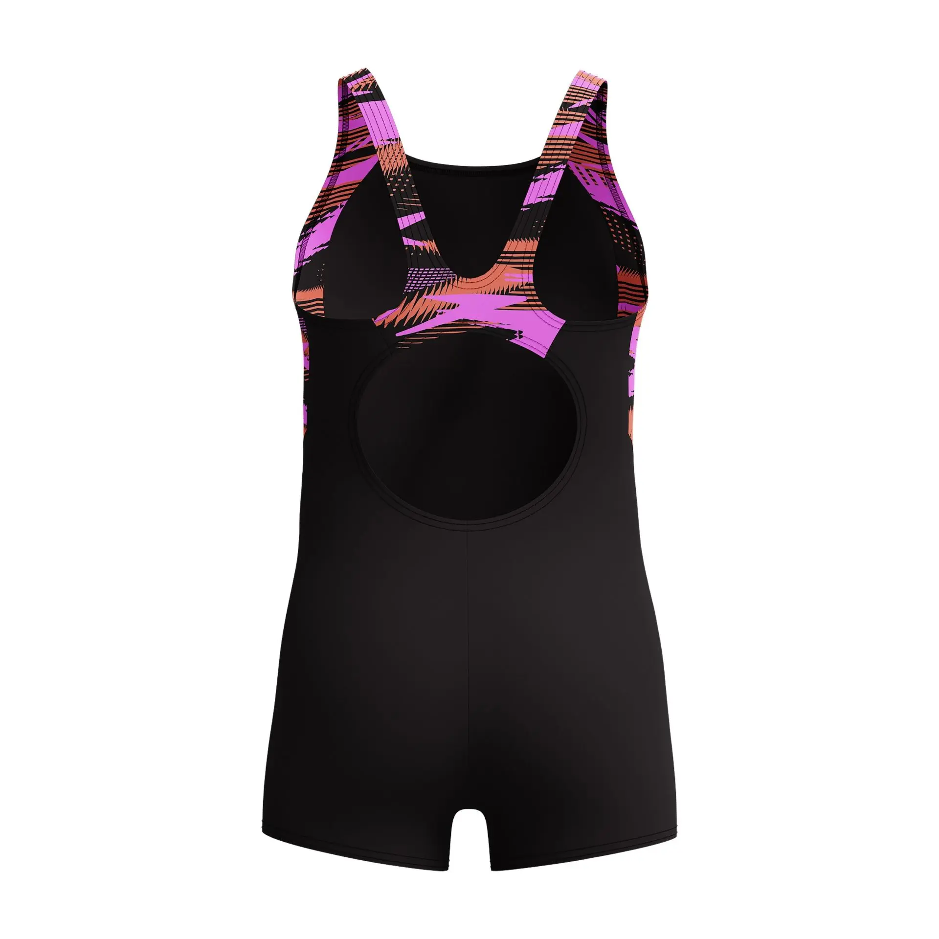 Iconic Speedo Style. This sporty navy Legsuit has a streamlined appearance and features a curved splice of our evolutionary HyperBoom graphic in contrasting shades of pink. Great for longer swim sessions, the Legsuit's muscleback style enables your child to achieve a full range of motion during their swim, while the Legsuit style offers greater coverage. Made from EnduraFlex fabric, it offers higher chlorine resistance than standard swimwear fabrics and fits like new for longer with CREORA® HighClo™. In addition, nylon yarns in the EnduraFlex fabric are made from 100% pre-consumer waste, such as waste fabric from factories.